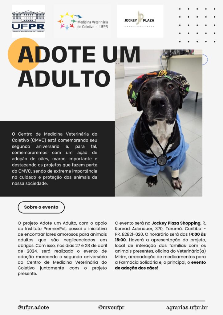 O Centro de Medicina Veterinária do Coletivo (CMVC) da Universidade Federal do Paraná (UFPR) comemora seu segundo aniversário com uma ação de adoção de cães, marco importante e destacando os projetos que fazem parte do CMVC, sendo de extrema importância no cuidado e proteção dos animais da nossa sociedade.