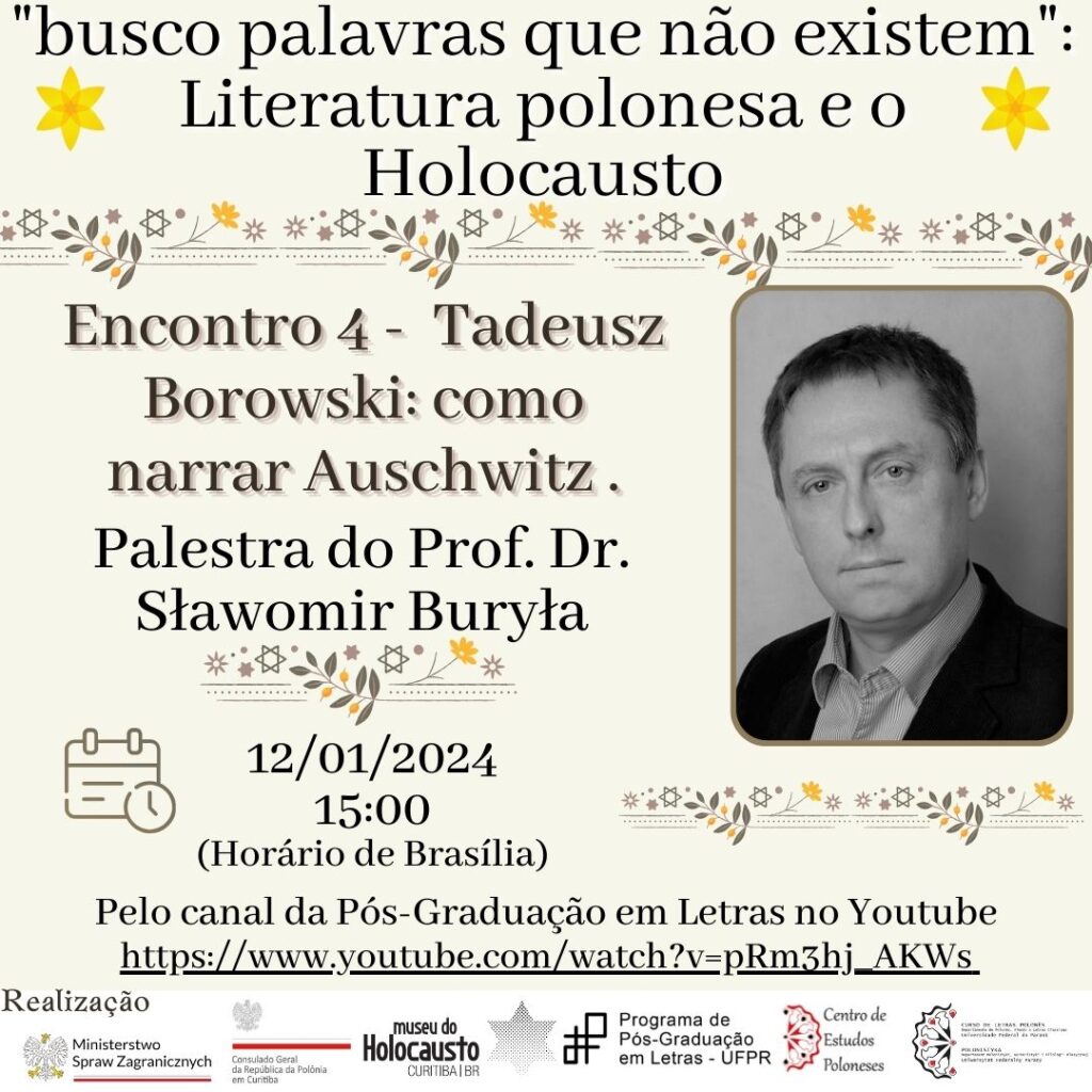 Em comemoração ao aniversário de 80 anos do Levante do Gueto de Varsóvia o Centro de Estudos Poloneses, o curso de Letras Polonês e o Programa de Pós-Graduação em Letras da Universidade Federal do Paraná promovem a programação “busco palavras que não existem”: Literatura polonesa e o Holocausto. A série de eventos é realizada em colaboração com Ministério de Relações Exteriores da República da Polônia, Consulado Geral da República da Polônia e o Museu do Holocausto de Curitiba.