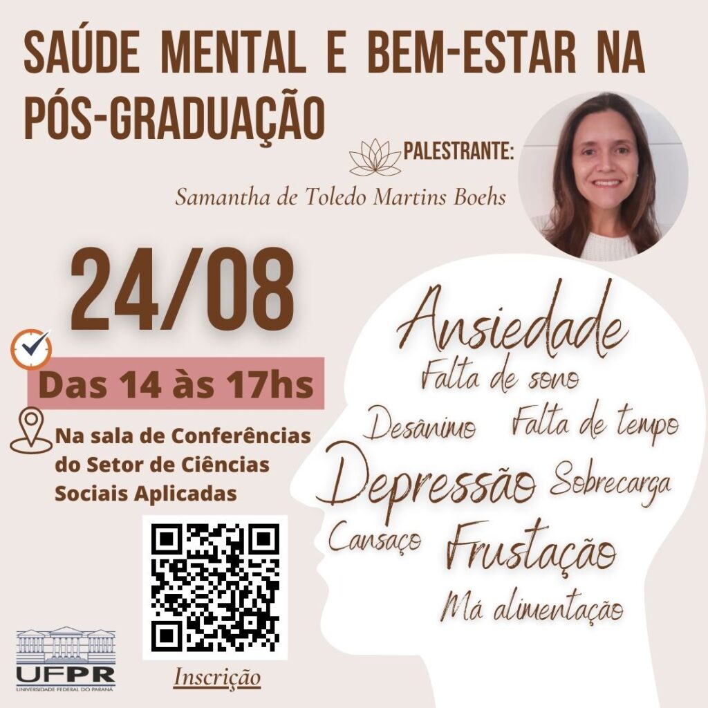 Os cursos do setor de Ciências Sociais Aplicadas da Universidade Federal do Paraná (UFPR), promovem um evento com foco na saúde mental e bem-estar na Pós-Graduação. Temas como depressão, desânimo, falta de sono e outros, serão abordados durante o encontro. A palestrante convidada é a docente do Departamento de Administração Geral e Aplicada da UFPR, Samantha de Toledo Martins Boehs. O encontro será no dia 24 de agosto, das 14h às 17h, na sala de conferência do setor de Ciências Sociais Aplicadas, campus UFPR Jardim Botânico.