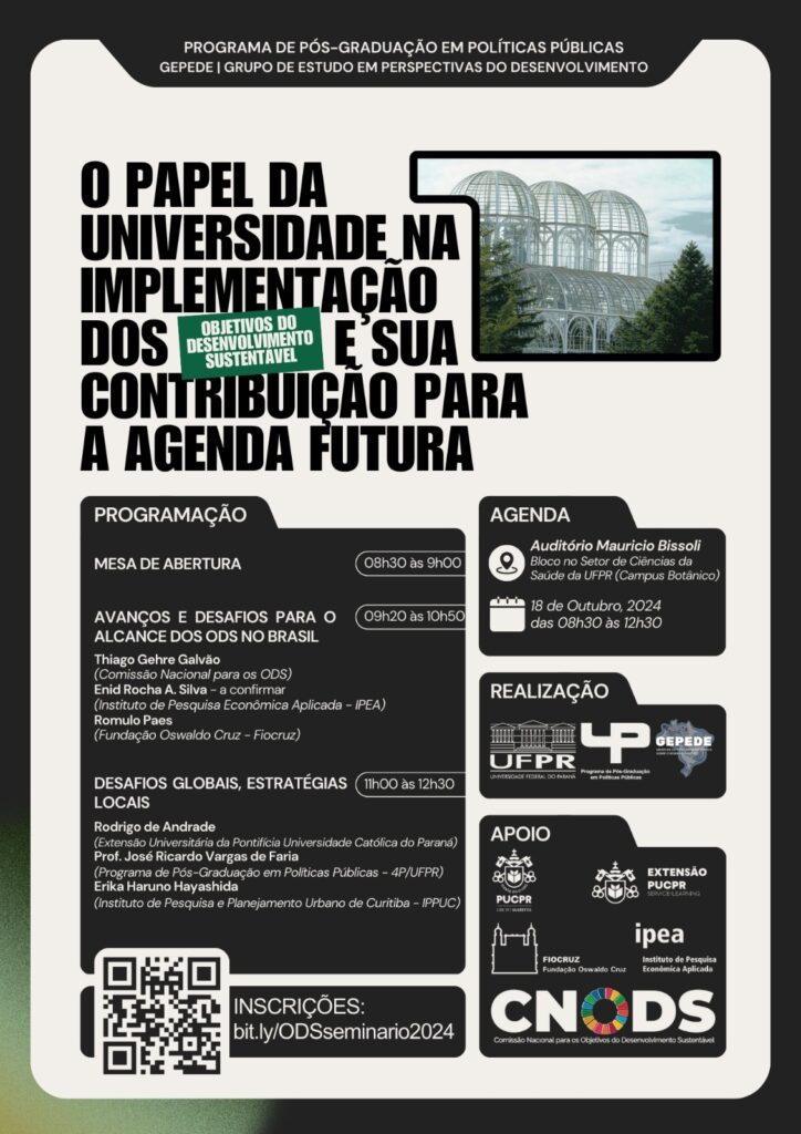 O Programa de Pós-graduação em Políticas Públicas (PPGPP) e o Grupo de Estudos em Perspectivas do Desenvolvimento da Universidade Federal do Paraná (UFPR) promovem, no dia 18 de outubro, o seminário “O papel da universidade na implementação dos ODS e sua contribuição para a agenda futura”.