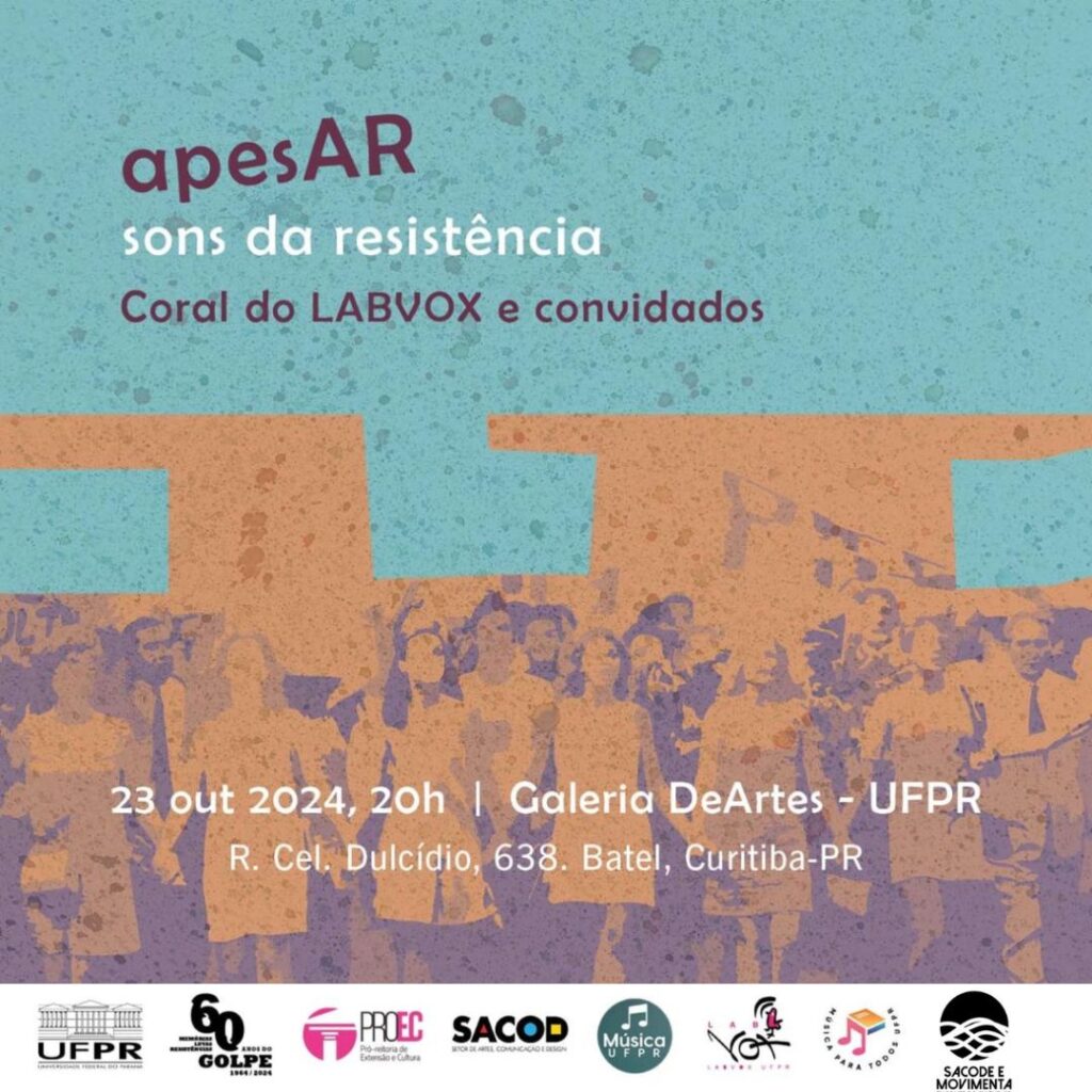 O Setor de Artes, Comunicação e Design da Universidade Federal do Paraná, promove no dia 23/10, a partir das 20h, a apresentação do LABVOX – Laboratório de Práticas e Ensino de Canto dos cursos de Música da UFPR, intitulada “apesAR: sons da resistência”. O evento acontece no DEARTES, campus Batel, UFPR.