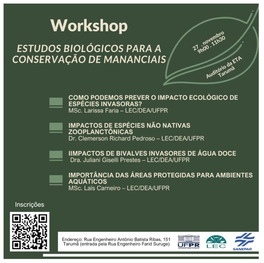 O Laboratório de Ecologia e Conservação (LEC) da Universidade Federal do Paraná (UFPR) e a Gerência de Pesquisa e Inovação da Sanepar (GPIN) estão com inscrições abertas para o Workshop de Estudos Biológicos para a Conservação de Mananciais. Gratuito, presencial e aberto ao público, o evento ocorrerá em 27 de novembro, às 9 horas, no Auditório do Tarumã, localizado em Curitiba. Será emitido certificado de participação. Para se inscrever clique aqui.