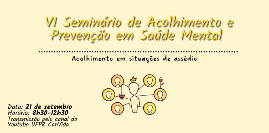 O programa institucional UFPR ConVida promove no dia 21 de setembro,  das 8h30 às 12h30, o VI Seminário sobre Acolhimento e Prevenção em Saúde Mental. Nesta edição o tema do evento é “Acolhimento em situações de assédio” e contará com palestrantes renomados e que possuem uma carreira relevante no enfrentamento do assédio e em práticas de acolhimento. Entre eles estarão presentes Lis Soboll, Juliana Bley, Roberto Heloani, Luciana Baruk, Claudia Mancebo, Patrícia Maeda, Mariana Aquino e Gabriel Ribeiro.