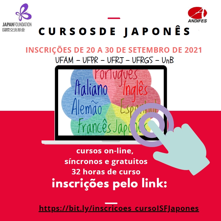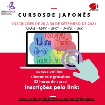 Estão abertas as inscrições para os cursos gratuitos de língua japonesa através da Associação Nacional dos Dirigentes das Instituições Federais de Ensino Superior – Idioma sem Fronteiras (Andifes IsF), em parceria com a Fundação Japão. Os cursos são on-line, abertos para a comunidade universitária – alunos, professores e técnicos. As inscrições podem ser feitas até as 12h do dia 30 de setembro, através do endereço https://bit.ly/inscricoes_cursoISFJapones , ou enquanto houver vagas.