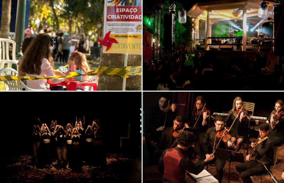Programação do Festival de Interno tradicionalmente busca atrair público diverso. Nas fotos, destaques da edição de 2018: recreação com crianças, show na praça e apresentações da Orquestra Filarmônica da UFPR e Téssera Companhia de Dança da UFPR. Fotos: Nicolle Schumacher/Sucom-UFPR, BD