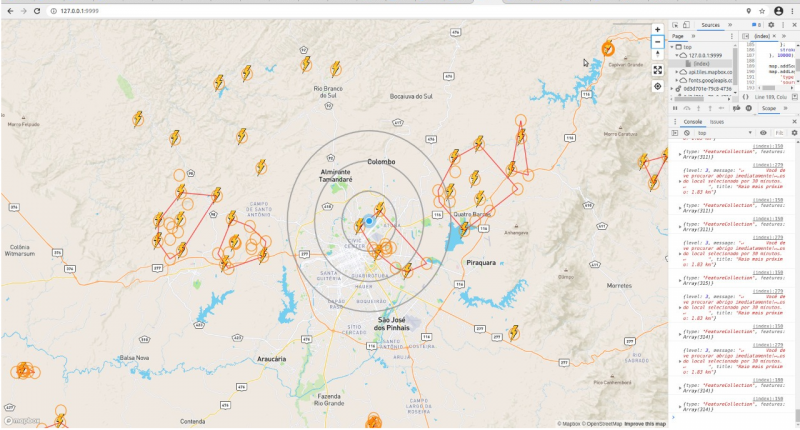 Simulação de funcionamento do StormDetector, indicando área (em círculo) com maior probabilidade de raios.