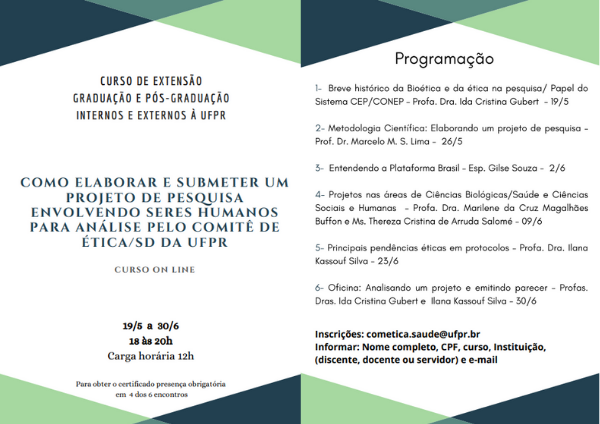 O treinamento on-line abordará aspectos teóricos e práticos sobre o envio e análise de trabalhos ao Comitê de Ética em Pesquisa do Setor de Ciências da Saúde. São ofertadas 80 vagas e as inscrições são gratuitas.