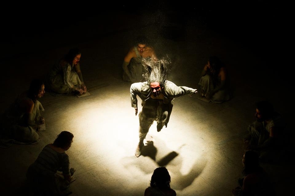 Com uma construção diferenciada do espaço cênico, proposto por Márcio Medina, o espaço é composto por duas cortinas de papel envelhecidas com figuras rupestres, que, ao serem manipuladas pelo coro de atores, modificam os espaços de atuação ao longo do espetáculo. Deste modo, o ambiente pode se desdobrar em até quatro partes, transformando-se continuamente.