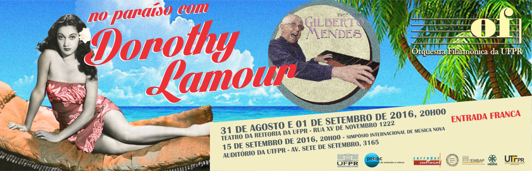 O segundo concerto de 2016 da Orquestra Filarmônica da UFPR traz uma homenagem ao compositor brasileiro Gilberto Mendes, falecido em 1º de Janeiro deste ano aos 93 anos. A apresentação acontece no Teatro da Reitoria nos dias 31 de agosto e 1º de setembro, com entrada franca. A regência é de Marcio Steuernagel e dos regentes assistentes Rafael Fortaleza e Ingrid Stein, a direção artística é de Harry Crowl.